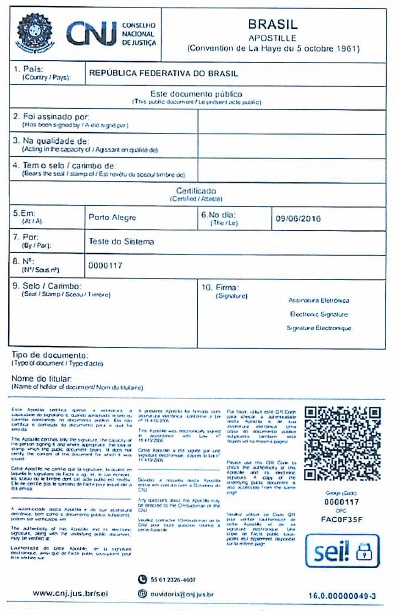4. CONSULTA ELETRÔNICA. A apostila leva incorporado um código QR (QR code) para verificação da autenticidade do documento.