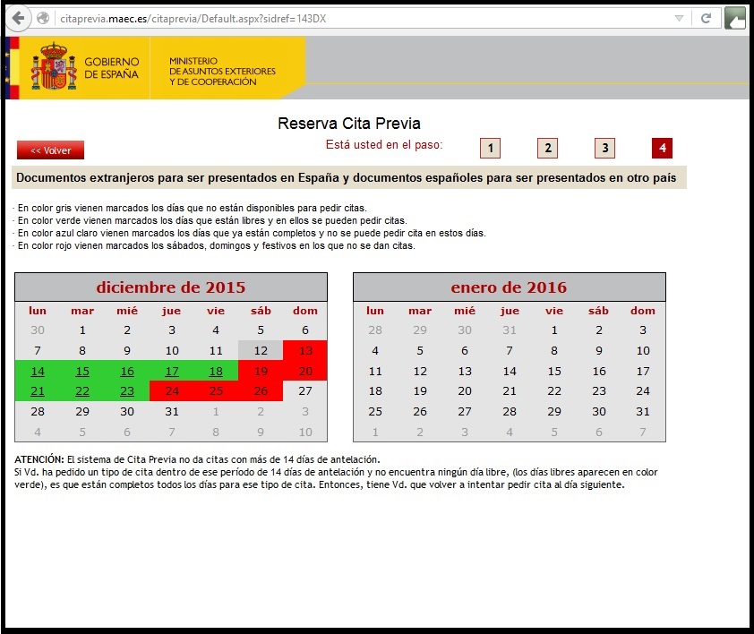Nesse momento nos abrirá o calendário com os dias livres em verde. O sistema somente permite selecionar um cita dentro dos 14 dias anteriores da mesma. No caso de que todos os dias estejam ocupados será necessário entrar no sistema no dia seguinte. Clicamos no dia desejado para ver os horários livres.