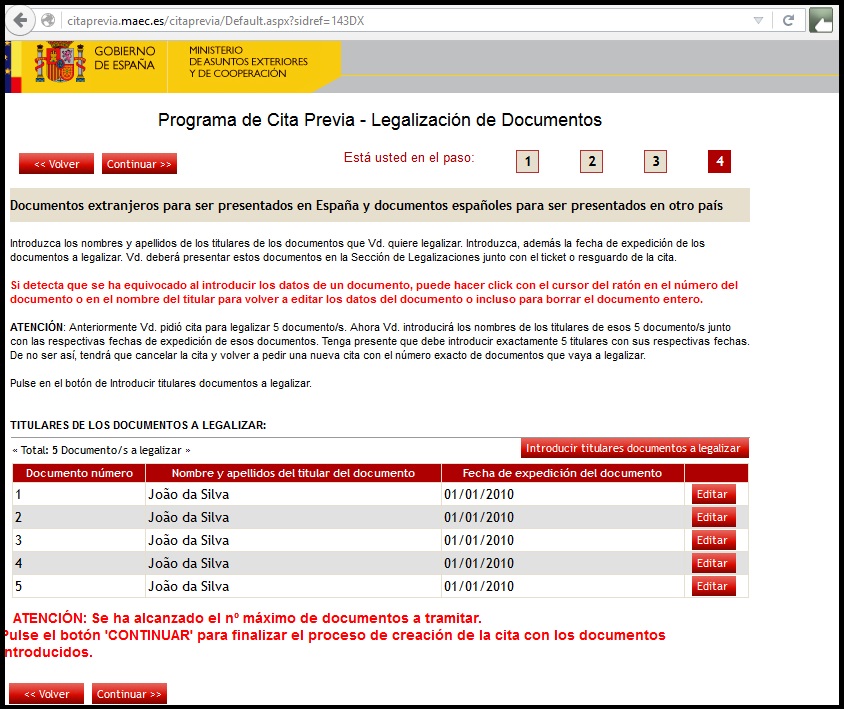 Após introduzir os dados de todos os documentos o sistema informará que se atingiu o limite de documentos solicitados. Poderemos confirmar os dados introduzidos, e se alguma correção deve ser feita, clicamos em “Editar”. Quando tudo estiver correto, clicamos em “Continuar”.